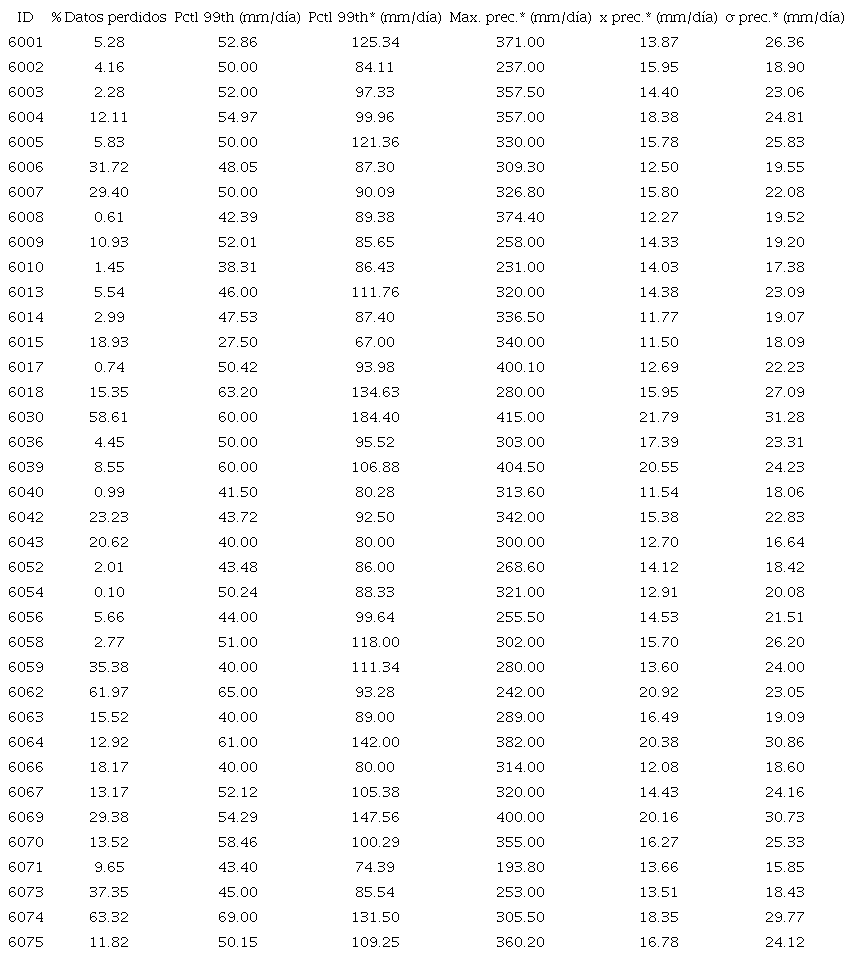Para el presente estudio se optó por utilizar un enfoque basado en picos sobre el umbral de la precipitación diaria. El umbral seleccionado fue el percentil 99th de los días húmedos; es decir, cuando la precipitación diaria registrada por la estación fuera diferente a cero (Agel et al., 2015; Oliveira et al., 2017). El uso de días húmedos permitió generar umbrales significativamente mayores (Tabla 1), facilitando la identificación de los eventos más severos. Asimismo, en la técnica de picos sobre el umbral, los datos faltantes no representan un problema tan crítico como en otras metodologías y permite la selección de umbrales por estación, lo que ayuda a reflejar las variaciones regionales y locales de estos eventos (Agel et al., 2015). Este proceso metodológico permitió la producción de una base de datos que concentra las fechas de los EEP históricos.