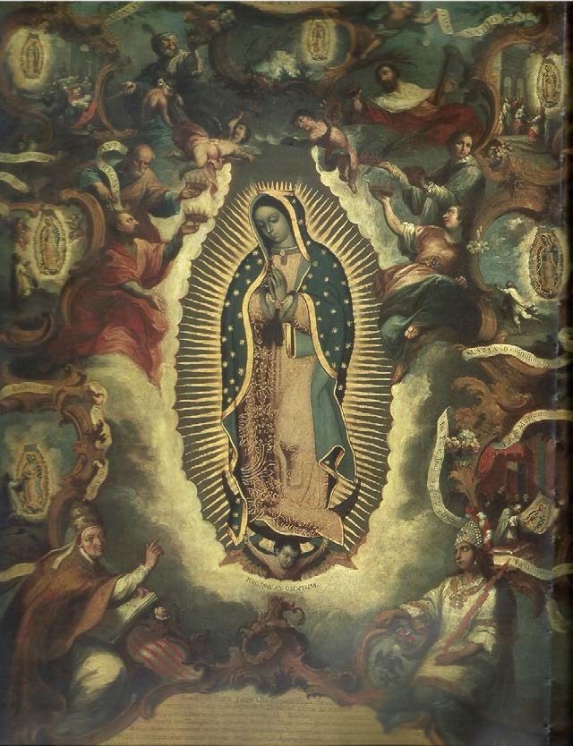 En la pintura de Juan Patricio Morlete Ruiz se repite la imagen de la Guadalupe siete veces en el marco que la encuadra como centro emisor de un discurso nacionalista.