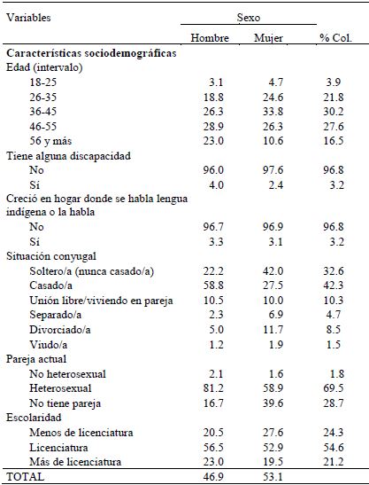 En este estudio se contemplan diversas variables que capturan las características del hogar, sociodemográficas, del trabajo y del uso del tiempo. Todas ellas han sido identificadas como covariables en estudios previos. Con respecto a las características del hogar, la existencia de menores de 15 años en el hogar y personas que requieren cuidados especiales (adultos mayores, discapacitados, etc.) son variables dicotómicas. El número de personas en el hogar es una variable continua que mide cuántas personas adicionalmente a la persona entrevistada viven en su hogar (oscila entre 0 y 14). Entre las variables sociodemográficas se encuentra edad medida de forma continua; situación conyugal tiene tres categorías (soltero/a o sin pareja; separado/a, divorciado/a o viudo/a, y casado/a o unido/a), al igual que escolaridad (preuniversitaria, licenciatura y posgrado). En términos de las características del trabajo, se tiene en cuenta el tipo de nombramiento (mando, enlace y operativo), y si la persona trabaja en su tiempo libre para cubrir los requisitos del trabajo. Finalmente, el último grupo de variables incluye el número de horas de trabajo doméstico semanales, la duración de la jornada laboral y si tiene la oportunidad de realizar actividades extralaborales/familiares como hacer ejercicio o practicar deporte; realizar actividades de voluntariado; acudir a iglesia templo o centro religioso; practicar alguna afición o entretenimiento; estudiar o tomar algún curso; y, otras. Se presentan análisis descriptivos y multivariados.