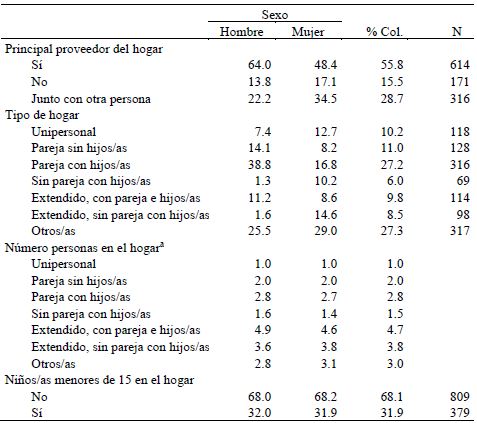 Las características sociodemográficas de los/as participantes en el estudio se muestran en la Tabla 1. Las características de los hogares se describen en la Tabla 2. Se observan diferencias relevantes entre hombres y mujeres, ya que el porcentaje de hombres que reportó que era el principal proveedor de su hogar es mayor que el de mujeres (64% vs. 48.4%). Mientras que casi cuatro de cada diez hombres reportaron que vivían con su pareja e hijos/as (38.8%), sólo 16.8% de las mujeres están en esta situación. Entre ellas está igualmente extendido que vivan en hogares extendidos sin pareja (14.6%) o que vivan solamente con sus hijos/as (10.2%). Alrededor de 32% de las personas tienen niños/as menores de 15 años a su cargo en el hogar.