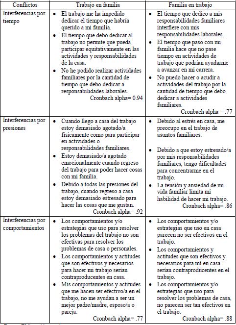 Las tensiones se expresan en tres dimensiones ( Greenhaus y Beutell, 1985): a) conflictos derivados de [la falta de] tiempo; b) conflictos derivados de la tensión; y, c) conflictos derivados del comportamiento. Cada una de estas dimensiones es bidireccional, ya que pueden ser conflictos en la vida personal/familiar que afectan en el trabajo, o a la inversa. Para la medición del conflicto se adaptó la escala de Carlson et al. (2000) (ver Cuadro 1).