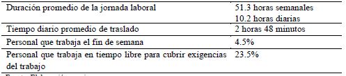 Por lo tanto, las personas dedican en promedio 13 horas al día a actividades laborales o asociadas a éstas. Además, 4.5% del personal trabaja los fines de semana. La duración de la jornada es especialmente larga en las unidades que realizan funciones de asesoría, ya que llegan a superar las 60 horas semanales. 23.5% de las personas reportaron que tenían que trabajar en su tiempo libre para cumplir con las exigencias del trabajo. Y, no se encontraron diferencias estadísticamente significativas por sexo con respecto a los tiempos destinados a cuestiones laborales.