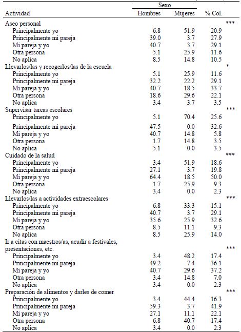 Después de las largas jornadas laborales, las mujeres que tienen niños/as menores de 15 años sobre los que tienen alguna responsabilidad reportan en mayor medida, que sus parejas son las principales responsables de realizar ciertas tareas vinculadas con el cuidado. En la Tabla 4 se aprecia que 51.9% de las mujeres reportan que son las principales responsables del aseo personal de los/as menores de 15 años, 25.9% de llevarlos/as y recogerlos/as de la escuela, 70% de supervisar las tareas escolares, 51% del cuidado de la salud de los/as menores, 33.3% de llevarlos/as actividades extracurriculares, 48.2% de ir a citas con maestros/as, acudir a festivales, representaciones en la escuela, etc., y 44% de preparar los alimentos y darles de comer. En el caso de los hombres, el porcentaje de hombres que reporta realizar esas tareas de forma exclusiva es mucho menor. Por ejemplo, sólo 5% de los hombres afirmó que la supervisión de la tarea escolar recae exclusivamente en ellos; es más frecuente, que sus parejas lo hagan, o si es que ellos participan compartan la responsabilidad con sus parejas.