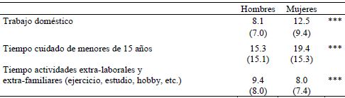 Que las mujeres sean las responsables principales del cuidado de los niños/as menores de 15 años va aparejado a que dediquen una mayor cantidad de tiempo a estas actividades que los varones. Como se aprecia en la Tabla 5, las mujeres que participaron en este estudio, en comparación con los hombres, dedican semanalmente en promedio más de cuatro horas al trabajo doméstico y al cuidado de los menores -si es que existen en el hogar- que los hombres (respectivamente, 12.5 horas vs. 8.1 horas y 19.4 horas vs. 15.3 horas).