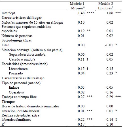 Se realizaron análisis bivariados y multivariados para examinar potenciales diferencias por sexo en función de las características sociodemográficas y del empleo. Éstas son muy pocas y no existe un patrón claro por dimensión (no se muestran los análisis). En la Tabla 6, se presentan dos modelos de regresión en los que se examinan las variables asociadas a experimentar conflictos o tensiones entre las mujeres (Modelo 1) y entre los hombres (Modelo 2), para dilucidar si los factores asociados a experimentar mayores tensiones varían por sexo. Los resultados muestran que sólo tres variables están vinculadas con el nivel de conflicto experimentado tanto para las mujeres como para los hombres (aunque con distinta intensidad y nivel de significancia). Ambos sexos ven incrementado el nivel de tensiones a medida que incrementa la duración de la jornada laboral, y cuando deben trabajar durante el tiempo libre para cumplir con los compromisos laborales. En cambio, el realizar actividades extra-laborales/familiares está relacionado negativamente con las tensiones. Aunque el realizarlas puede conllevar mayores tensiones porque implicaría poder dedicar menos tiempo a la esfera familiar o laboral, también es posible que las personas que experimentan menores tensiones dispongan de mayor tiempo para poder realizar otras actividades de recreación u ocio.