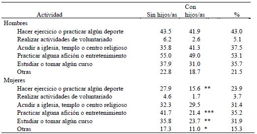 En la Tabla 7 se examina si la realización de actividades extralaborales/familiares está asociada con el sexo y la presencia de niños/as menores de 15 años sobre los/as que tienen alguna responsabilidad. Los datos muestran que, entre los hombres la realización de las actividades examinadas no está estadísticamente asociada a la presencia de niños/as en el hogar. Sin embargo, en el caso de las mujeres, aquellas que tienen hijos/as tienden a realizar la mayoría de estas actividades en menor medida. El porcentaje de mujeres en cuyos hogares no hay menores de 15 años y que practican algún deporte o hacen ejercicio es 78% mayor al de las mujeres con menores en su hogar (27.9% vs. 15.6%). El porcentaje de mujeres sin menores en su hogar que practica alguna afición o entretenimiento es casi el doble que el de las mujeres con menores en el hogar (41.7% vs 21.4%). Asimismo, la presencia de niños/as menores de 15 años en el hogar afecta negativamente el desarrollo escolar de las mujeres, ya que el porcentaje de mujeres que reportó estudiar o tomar algún curso es significativamente menor entre las que tienen menores de 15 años en su hogar que entre las que no los tienen (23.7% vs. 35.8%).