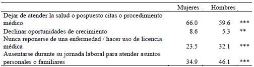 Poco más de seis de cada diez personas que participaron en el estudio (61.5%) indicaron que, en los últimos dos años han dejado de atender su salud por cuestiones de trabajo, y/o han pospuesto una cita médica o procedimiento médico por cuestiones de trabajo (ver Tabla 8). Las mujeres lo reportan en mayor medida que los hombres (66% vs. 59.6%). Sin embargo, el porcentaje de hombres que indicó que “nunca había dispuesto de tiempo para reponerse de enfermedad o hacer uso de una licencia médica” y/o que había podido “ausentarse del trabajo para cuidar a hijos/as cuando se enferman” es significativamente mayor que al de mujeres (respectivamente, 32.1% vs. 23.5% y 46.1% vs. 34.9%). Esto puede reflejar la construcción social de las diferencias de género, que en el segundo caso atribuyen a las mujeres las responsabilidades de cuidado de los hijos/as, por lo que es posible que haya mayor resistencia de los hombres tanto a solicitar permisos como a que les sean otorgados por la institución.