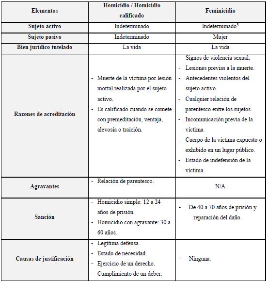 En México, el proceso de construcción del tipo penal feminicidio requirió argumentos para diferenciar un homicidio de un feminicidio. El Observatorio Ciudadano Nacional del Feminicidio (OCNF) sistematizó estas diferencias y las clasificó como elementos normativos, objetivos y de sanción del tipo penal de feminicidio. Estas consideraciones se encuentran ya integradas en el Artículo 325 del Código Penal Federal, para contemplar a los feminicidios como un delito grave. Todo ello fue decretado el 14 de junio de 2012 ( Vargas, 2018). Sin embargo, no fue fácil tipificar habiendo otros tipos penales aparentemente similares. A continuación, presentamos un cuadro comparativo.