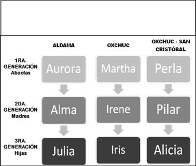 Irene, Pilar y Alma, conforman la segunda generación, las dos primeras son originarias de Oxchuc y hablantes de tseltal y español, mientras que Alma es originaria de Aldama y es monolingüe en tsotsil. Sus edades fluctúan entre los 42 y los 56 años. Al igual que sus madres, ellas nacieron en hogares campesinos indígenas. Las tres asistieron a la escuela primaria, aunque Alma sólo cursó hasta el tercer grado por no haber más escuelas en su pueblo. Irene y Pilar tuvieron que migrar a pueblos aledaños para poder estudiar secundaria y la escuela normal, al mismo tiempo que comenzaban a trabajar. Alma y Pilar fueron casadas de acuerdo a la costumbre indígena, mientras que Irene transgredió dicha costumbre al huir con su novio. Por unos años, Alma y su familia fueron parte de una comunidad zapatista; actualmente ella es ama de casa y campesina. Irene y Pilar son profesoras de primaria casadas con profesores. Pilar ya se jubiló e Irene es además regidora de su municipio.