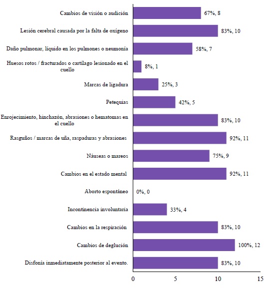 Sobre los indicadores de asfixia, los cambios en la deglución, tales como dificultad o dolor, dificultad para tragar sólidos, líquidos o que degluten con molestia durante aproximadamente quince días estuvieron presentes en todos los casos. Los cambios en el estado mental, como trastornos del sueño, amnesia, estrés, inquietud o combatividad estuvieron presentes en 92% de los casos (once), y para los siguientes casos lesión cerebral, causada por falta de oxígeno, rasguños/marcas de uña, raspaduras y abrasiones por lesiones ofensivas o defensivas; cambios en la respiración, ya sea dificultad o inhabilidad para respirar o tos con flemas por dos semanas; enrojecimiento, hinchazón, abrasiones o hematomas en el cuello y disfonía inmediatamente posterior al evento, como cambios de voz, ronquera, voz áspera o pérdida de la voz por aproximadamente 21 días se encontraron en 83% (diez casos) (ver gráfica 1).