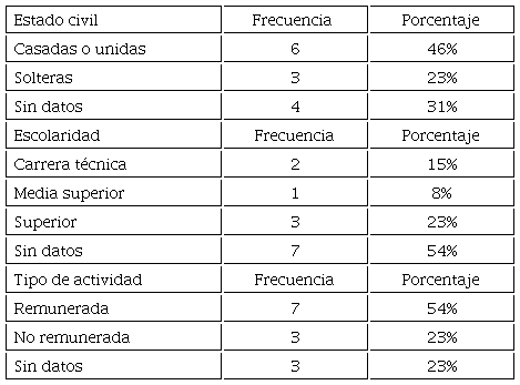 Respecto a la edad de las víctimas se encontró que el rango va de 18 a 54 años, donde la media es de 29.7 (Desviación Estándar 10.8), en tres casos se desconoce la edad. Por otro lado, 38% (cinco casos) de las mujeres están casadas, 23% están solteras (tres casos), 8% viven en unión libre (un caso) y de 31% (cuatro casos) no se tiene información.