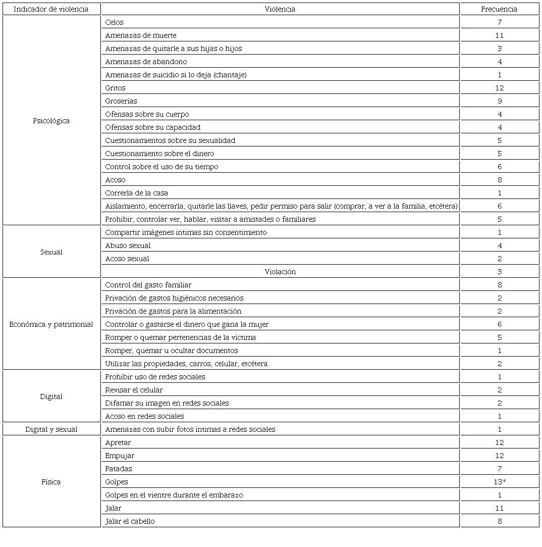 Los 12 casos analizados, dejan ver que las conductas violentas reportadas por las mujeres son múltiples. Entre las expresiones más frecuentes están la violencia psicológica: celos, amenazas de muerte, gritos, groserías, acoso, control del tiempo y aislamiento; violencia económica: control del gasto familiar y del dinero que gana la víctima; violencia física: apretar, empujar, patear, golpear y jalar del cabello. Lo anterior sustenta que los episodios de violencia son sistemáticos y continuos en contextos de relación de pareja y expareja.