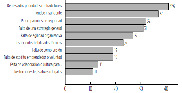 Como se puede ver, no son las limitaciones impuestas por la ley la razón por la que los gobiernos no son capaces de adoptar estrategias de gobierno digital adecuadamente. Se trata, más bien, de problemas de gestión: la falta de claridad estratégica de cuáles son las prioridades, la decisión de canalizar los recursos suficientes, la falta de capacidad para gerenciar el cambio organizativo y el fallar en adquirir las habilidades requeridas. Aún más, de acuerdo con el mismo estudio, los retos son diferentes dependiendo de la etapa de madurez en la que se encuentre la organización: así, la falta de adecuada comprensión de las implicaciones de la digitalización y el no contar con una estrategia general son más importantes en los estadios tempranos, mientras que más adelante importan más la falta de prioridades claras y de recursos (Eggers y Bellman, 2015).