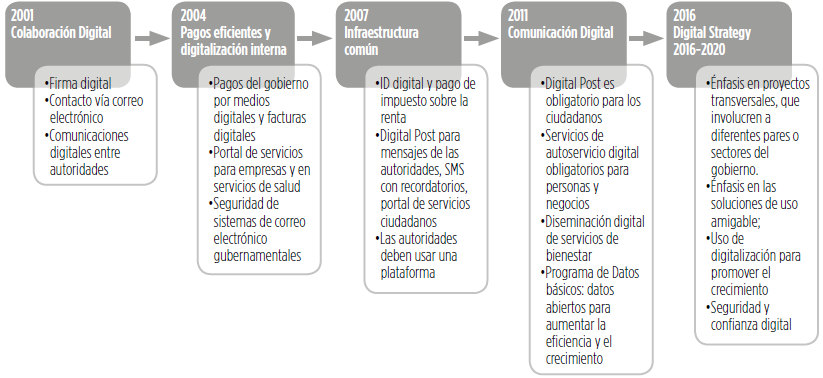 Las políticas de gobierno digital en Dinamarca se han desarrollado en varias etapas como se muestra en la siguiente ilustración. Es importante señalar que se ha hecho un esfuerzo importante para alinear la legislación nacional para favorecer el uso de herramientas digitales en la operación del gobierno y en sus interacciones con la sociedad. Así mismo, se ha invertido en lograr la colaboración interinstitucional dentro del gobierno y entre los gobiernos nacional y locales, creando bases de datos conjuntos y sistemas compartidos.