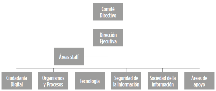 La Dirección Ejecutiva es responsable de la operación de la Agencia, atendiendo los mandatos del Consejo, cuenta con seis áreas, cinco de negocio y una de apoyo. Las líneas de negocio son: Ciudadanía digital (que trabaja para fomentar el uso de las tecnologías por parte de la sociedad); Organismos y procesos (que coordina transversalmente los proyectos de gobierno electrónico); Tecnología (que ofrece soluciones tecnológicas para el gobierno electrónico); Seguridad de la Información (que establece el marco regulatorio tanto dentro como fuera del gobierno respecto a la seguridad digital); y Sociedad de la Información (que realiza tareas orientadas a fomentar una sociedad que aproveche la información y el conocimiento para el desarrollo) (Barrera, 2015). El personal de la AGESIC pasó de 145 personas en 2011 personas a 225 en 2015, la mayoría de alto perfil técnico en tecnologías.