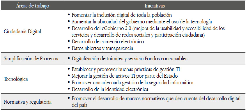 Como parte de la ejecución de su Agenda Digital 2011-2015, la agencia ha desarrollado acciones en temas como el desarrollo de habilidades digitales para la inclusión, la aplicación de TIC para mejorar el bienestar social, la aplicación de inversiones para el desarrollo de la infraestructura tecnológica nacional, la creación de soluciones digitales para la gestión ambiental y de emergencias, la integración y mejora del acceso de procesos de servicio, el desarrollo de los estándares de confianza y seguridad en las tecnologías digitales y la generación de estadísticas especializadas (Parra Silva s.a.).