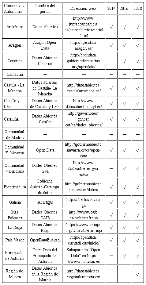 Abstract: The Autonomous Communities, currently immersed in a deep debate about their future within the normative framework of the Spanish state, are entities with a certain legislative autonomy that manage an important volume of public funds. For their unquestionable interest, they have been chosen as the territorial scope of our study, which focuses on analyzing their open data portals. The research evaluates the interaction options available in the websites associated with two pillars of open government: participation and collaboration, dealing with the possibilities of requesting information, the existence of social networks or the contents syndication. To this end, the regional open data portals were visited on two occasions, first, coinciding with the emergence of the initiatives in 2014 and, secondly, in 2018 (four years later). The results should be classified as poor, the recently inaugurated portals only incorporate contact information, and the previously existing ones do not present advances but important recessions in terms of the possibilities of web syndication