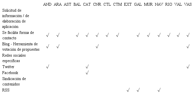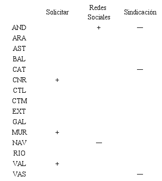 La tabla 2 muestra la desigual cobertura autonómica de los aspectos analizados: el apartado de solicitud de información y/o blog triplica, tanto a la existencia de redes de redes sociales, como a la sindicación de contenidos. Igualmente nos llama la atención que ni una sola de las CC. AA. complete las tres categorías, existiendo tres autonomías que no ofrecen ningún servicio (al Principado de Asturias se le suman Comunidad de Madrid y Cantabria sin portal), nueve con una sola posibilidad ofertada (Aragón, Islas Baleares, Canarias, Castilla y León, Castilla-La Mancha, Extremadura, Región de Murcia, La Rioja y Comunidad Valenciana) y cinco con dos opciones habilitadas (Andalucía, Cataluña, Galicia, Comunidad Foral Navarra y País Vasco).