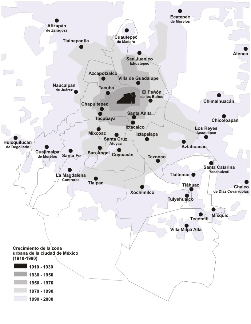 Previendo esta situación, desde hace varias décadas se advirtió que la Ciudad de México debería de dejar de crecer, pero a pesar de que hubo leyes, planes e instituciones, el resultado fue totalmente contrario, pues de 350 mil habitantes que tenía la ciudad en el año 1900, hoy la ZMVM casi llega a los 22 millones, después de haber desecado los cinco lagos que ocupaban más de 1000 km2 de superficie; ahora, a esa población hay que sumar los seis millones de habitantes de las ciudades de las entidades federativas que forman la Corona Regional de la Ciudad de México (Delgado, 1999:171), para la cual se creó la Comisión de la Megalópolis.