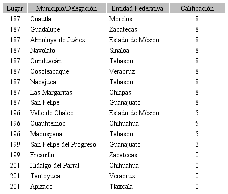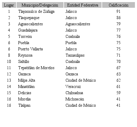 A continuación en el cuadro no. 1, se enlista una muestra del ranking de los municipios que obtuvieron los mejores resultados, los que se ubicaron en los primeros lugares por sus calificaciones: