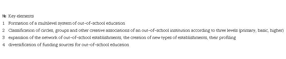 Key elements in the field of organizational support of out-of-school education are presented in table 1.