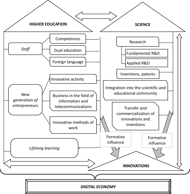 The above is grouped and represented by the data of Fig. 3. In our opinion, it is useful to influence of the higher education system on the processes of development of the digital economy through the prism of the universities’ educational, research and innovation activities.
