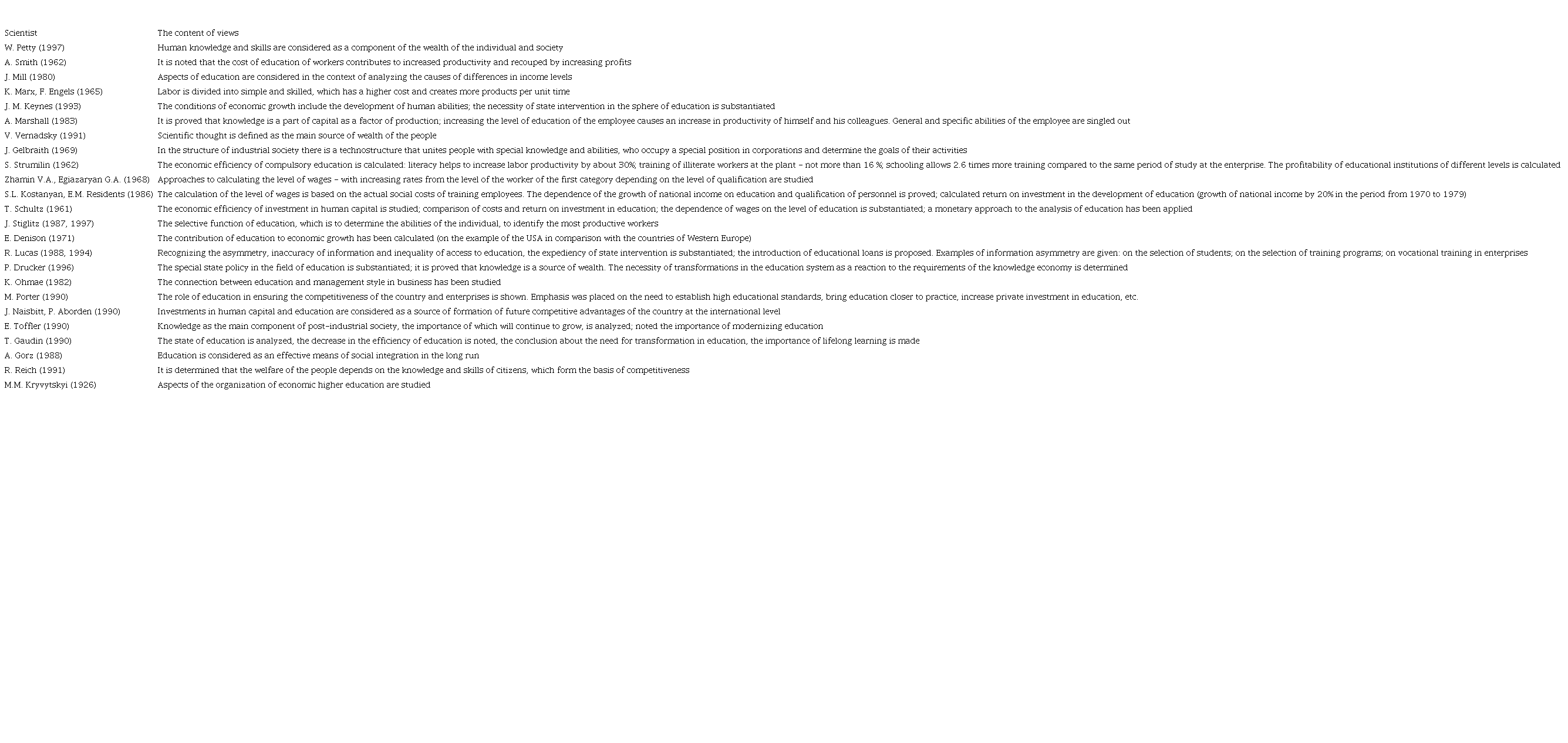 To ensure the completeness of our study, key scientific views on the role of education in the development of society and the national economy are systematized in table 1. From the data of table 1 shows that both the classics of economics and modern scientists unequivocally state the significant impact of knowledge and education on the dynamics and effectiveness of economic processes, labor productivity, incomes, and economic growth in general.