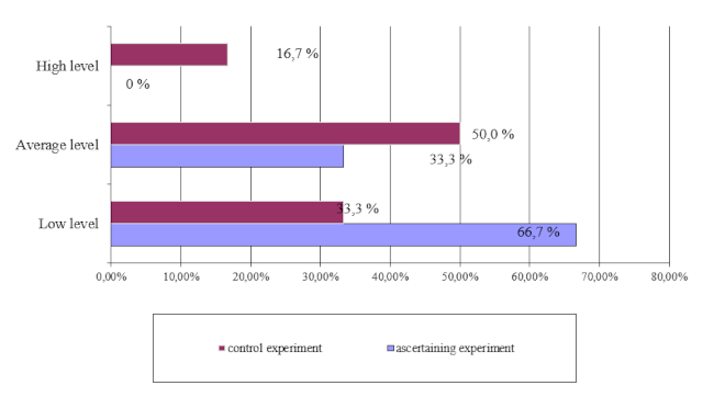 Comparing the results of the two experiments, we can conclude that the number of children at the low level has reduced by 33.4%, the average level indicators have risen by 16.7%, and the high level of psychomotor development not detected before the experimental learning is detected in 16.7% of the preschool children.