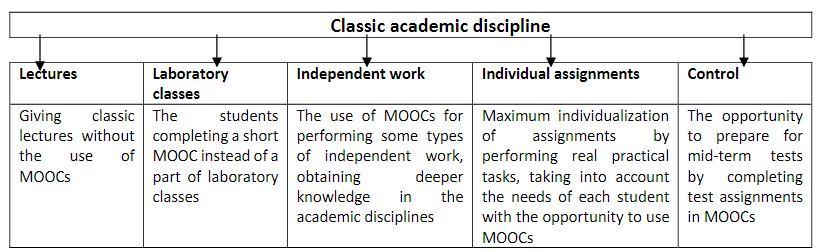 Even though MOOCs are a new phenomenon in the modern education environment, especially in the Russian education system, we advise their partial introduction in the academic disciplines at higher education institutions. This makes it necessary to establish the ways for the integration of MOOCs into the structure of classic academic disciplines.