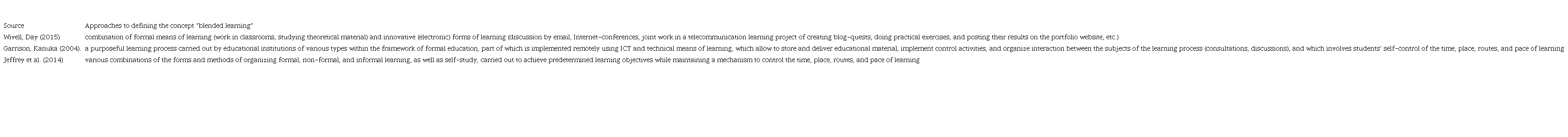 Researchers in the field of blended learning offer different approaches to the definition of the concept (Table 1).