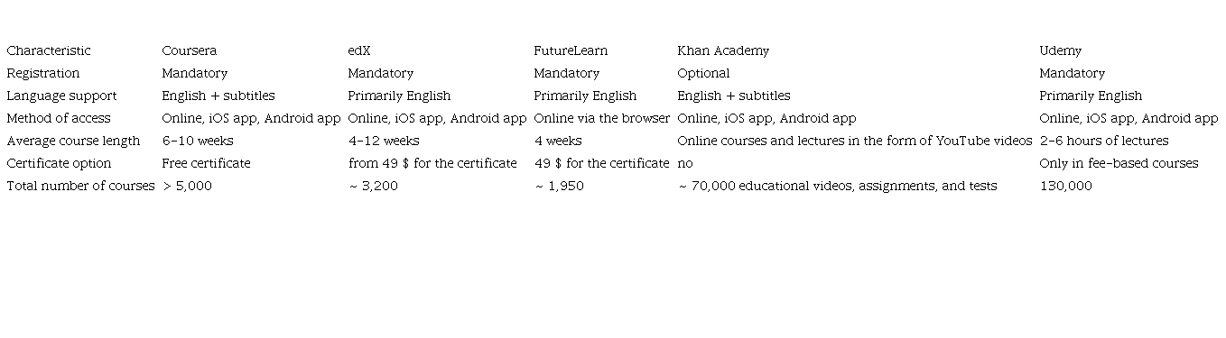 As demonstrated by the results of comparative analysis, most of the world MOOC platforms have their courses in English (many have subtitles in other languages), do not offer the opportunity to get a free certificate (with the exception of several courses on Coursera), and the length of the courses offered ranges between several weeks to several months.