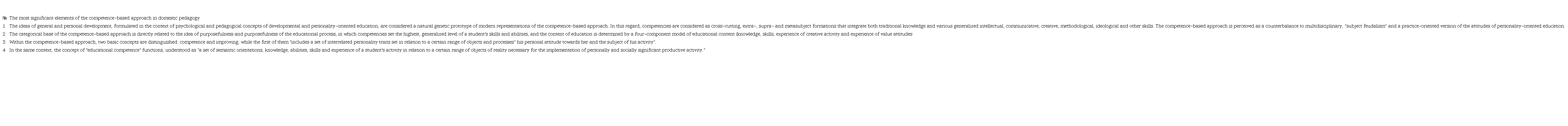 It is possible to formulate some generalized image of the most significant elements of the competence-based approach in domestic pedagogy (Table 1) (Kovalevskaia, Gilyazeva, Lobazova, Duborkina, Sokolova, 2021).