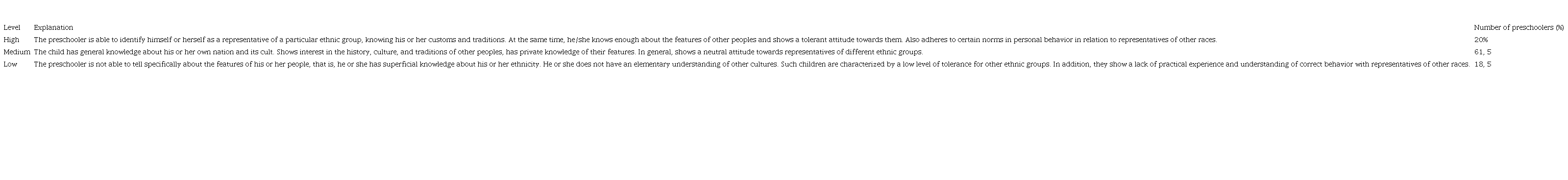 This correlates with world practice (Walter, 2017). Such results indicate the need for further targeted work of preschool institutions in the field of education of tolerant personalities (Acar-Ciftci, 2016).