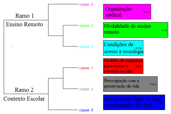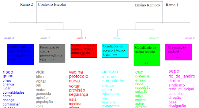 Observa-se na Figura 1, que os textos se dividiram em duas áreas temáticas. A primeira, Ramo 1, trouxe questões relacionadas ao ensino remoto, envolvendo três classes: Classe 3 – Modalidade de ensino remoto; Classe 4 – Condições de acesso à tecnologia; e, Classe 6 – Organização sindical. Destaca-se a conexão entre as classes 3 e 4, pois levantaram discussões sobre os tipos de modalidade de ensino remoto e a disponibilidade de recursos tecnológicos para garantir a universalização da educação, e a classe 6 retratou o posicionamento político enquanto servidor público. A segunda, Ramo 2, problematizou a pandemia no contexto escolar e agrupou a Classe 1 – Medidas de segurança para o retorno e estrutura escolar; Classe 2 – Preocupação com a preservação da vida; e a Classe 5 – Escola como lugar de risco e propagação do vírus. As classes 1 e 2 relacionaram a preservação da vida e a necessidade de cumprir um protocolo de segurança nas escolas com a estrutura física apresentada nas unidades escolares, enquanto a classe 5 se preocupou com a propagação do vírus para as famílias de alunos e profissionais.