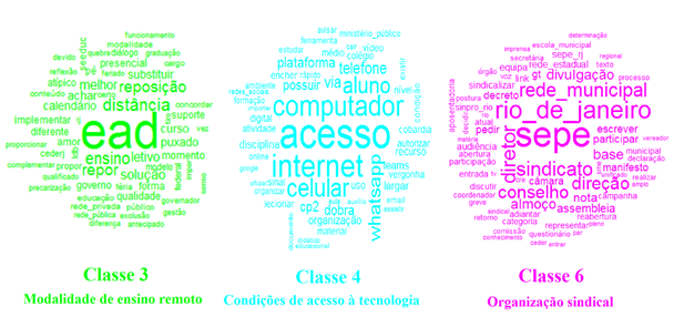 Observa-se nessa área a busca por soluções para continuação das atividades escolares. Nesse momento, o uso das tecnologias digitais se apresentou como o único modo de promover a continuidade da oferta de ensino, e os professores questionaram a igualdade de acesso, tendo em vista a desigualdade social vivenciada, principalmente nas instituições públicas de ensino. Outro ponto levantado pelos profissionais, nos meses de março e abril, foi a impossibilidade de se transformar as aulas presenciais em EaD. Até aquele momento não se falava em ensino remoto emergencial. A confusão entre EaD e aulas emergenciais estava posta. Depois de muito questionamento e constatação das diferenças entre o oferecido emergencialmente e o EaD iniciou-se o ensino remoto emergencial. Devido à falta de formação continuada e a falta de estrutura sanitária observou-se inquietações e questionamentos dos profissionais nas classes 3 e 4, dentro da área temática do ensino remoto. Já a classe 6, teve seu foco temático na luta sindical e, embora esteja no Ramo 1, é presente em todos os meses de coleta, conforme demonstra a Figura 2.