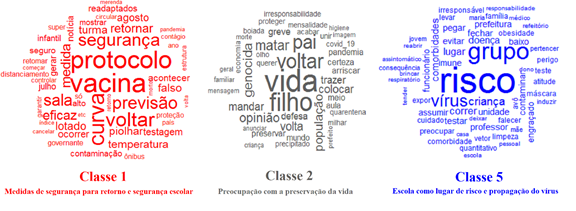 A Classe 1 (Figura 3) evidenciou a necessidade de protocolos de segurança para o retorno das atividades presenciais. Soares e Schoen (2020) destacam que a reabertura de escolas deve considerar a situação epidemiológica de cada região e as condições de infraestrutura de cada instituição. Os profissionais de educação se mostraram preocupados com um retorno presencial quando a curva de contágio subia e a ocupação dos leitos estava alta: “Com a curva só aumentando, é descaso com a vida de alunos, profissionais da educação e responsáveis” (ST, 03 jun. 2020). Principalmente, pela imensa rede de contatos que o ambiente escolar envolve, com muitas pessoas de convívio próximo e que se movimentam pela cidade.