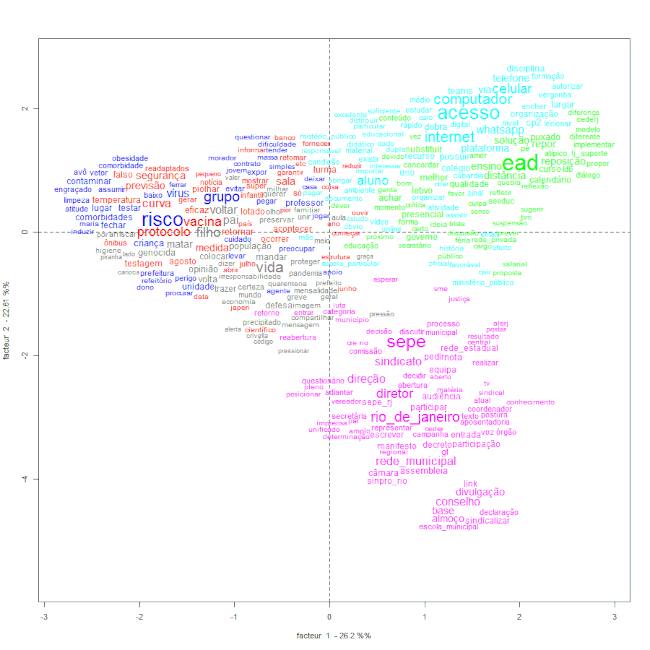 Após a análise das classes e seus STs, comprovou-se a percepção inicial de que os temas das falas se modificaram entre os meses de coleta. O primeiro eixo temático – Ensino remoto – é discutido nos primeiros meses de fechamento das unidades escolares, nas classes 3 e 4. Quando observamos o gráfico de coordenadas cartesianas (AFC – Figura 4) estas classes estão correlacionadas.