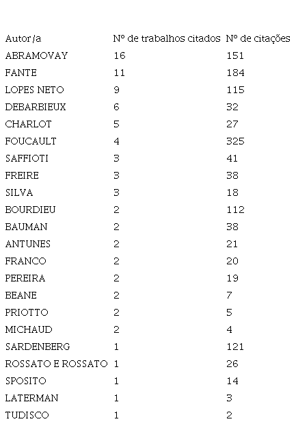 Os dados apresentados na Tabela 1 são resultantes da análise realizada no resumo, no corpo do texto e nas referências. Primeiramente, foram identificadas/os autoras/es que trabalham diretamente com a temática da violência, como: Abramovay (2002), Laterman (2000), Michaud (2001) e Sposito (2001), Charlot (2002), Saffioti (2001); Debarbieux (2001, 2002) e Priotto (2006). Em seguida foram identificadas autoras/es sobre a temática do bullying: Fante (2005), Lopes Neto (2005), Pereira (2009), Antunes (2010), Silva (2010), Beane (2011), Tudisco (2011), Franco (2014), Rossato e Rossato (2013).