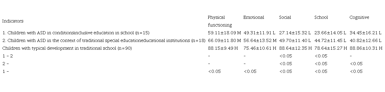 Results. It is expected that the levels of almost all indicators of quality of life of children with ASD are significantly (p <0.05) lower than in children with typical development. Thus, most GP children do not have any problems in various aspects of activity and communication. Compared with children with typical development, children with ASD who study in traditional conditions, although they have lower rates, but differ slightly in terms of physical and emotional functioning; however, they have significant differences from children with typical development in terms of social, school and cognitive components of quality of life (table 1).