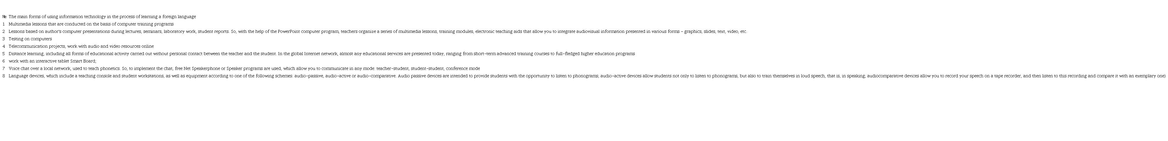 Considering in this regard the technological aspect of education in universities, we note that they are currently the most widely used personality-oriented and information technologies of education. Personally oriented technologies are represented by technologies of differentiation and individualization of education, project technologies, etc. Table 1 shows the main forms of using information technology in the process of learning a foreign language.