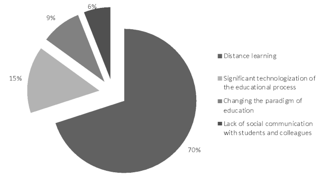 It was also pointed out that with distance and online learning in the absence of direct emotional, energetic, suggestive contact between students and the teacher, the effect of depersonalization of the subjects of the educational process arises. This undoubtedly "has a negative impact on the psychological and emotional state of all participants and, first of all, on teachers as people who are responsible for this process and its result." (Van Nuland et al, 2020).