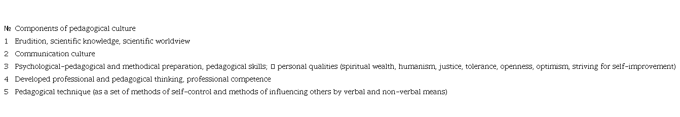 Pedagogical culture is a complex socio-pedagogical phenomenon that should be considered as an integrated unity of certain structural components harmoniously combined with each other: scientific worldview and scientific knowledge, erudition, spiritual wealth, special personal qualities (humanism, justice, tactfulness requirements, striving for self-improvement), culture of pedagogical thinking, psychological, pedagogical and methodological training, perfect mastery of pedagogical techniques, positive pedagogical image, external aesthetic appeal.).