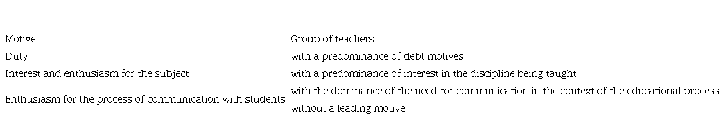 According to the nature of the predominance of these motives, four groups of teachers are distinguished (Table 2).