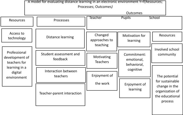 Through the research, the main factors affecting learning effectiveness at the school, classroom, and individual level (students, teachers, and parents) were identified and analyzed. Created a logical evaluation framework model linking the resources of the educational distance process, the organization and the flow of learning and teaching processes, available systems to adapt and support learning and achievement for students, teachers, parents, and school (Deineka, 2020).