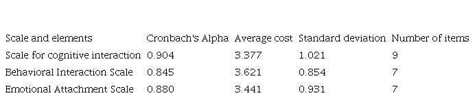 Results below 3 are considered low levels of cognitive engagement. To test the construct validity of the cognitive attachment whines, confirmatory factor analysis was conducted using the principal components method with a Varimax rotation with Kaiser's Ormalization. The Kaiser-Meyer-Olkin Measure of Sampling Adequacy shows much good sample adequacy KMO= 0.93. Bartlett's test for sphericity, χ2=19487.86; p<.001, shows that correlations between variables are large enough for principal component analysis. One factor was determined to include the 7 items (questions) considered, the total explained variance after rotation is 56.8%, and the actual value is -5.11. These results indicate that the cognitive interaction scale is constructively valid for the samples given.