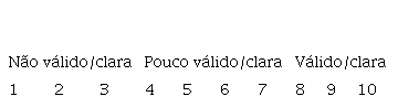 A tabela 1 mostra a escala utilizada para indicação da validade de conteúdo e da clareza da linguagem, com valores de 1 a 10 pontos distribuídos em escala de Likert com três categorias: a) não válido/clara, para pontuações de 1 a 3; b) pouco válido/ clara, para pontuações de 4 a 7; e, c) válido/clara, para pontuações de 8 a 10. Neste sentido, a(os) colaboradora(es) “se posicionam de acordo com uma medida de concordância atribuída ao item e, de acordo com esta afirmação, se infere a medida do construto” (Silva Junior & Costa, 2014, p. 5).