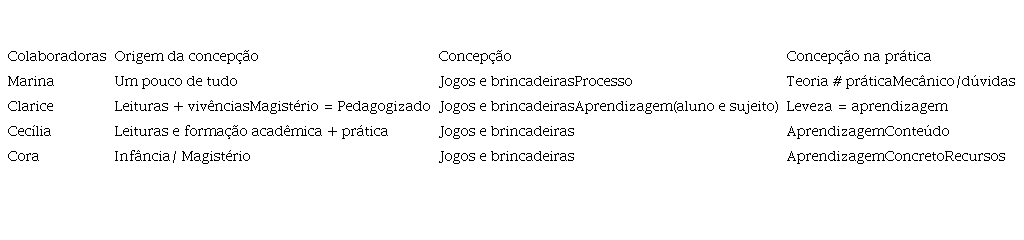 Assim, Cecília fala dessa concepção mais vinculada a prática de atuação profissional e que as compressões da importância disso, está no cerne da experiência e na busca por mais conhecimento. Clarice remete as suas vivências e as leituras como um modo de construir conhecimento e evoca suas antigas professoras, como sendo aquelas com quem aprendeu muito e de quem recebeu incentivo. A prática, dessa forma, é tomada como este lugar de construção de suas aprendizagens, inclusive, a respeito do lúdico.