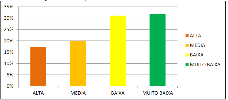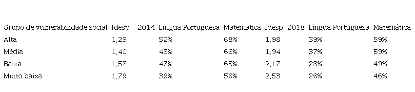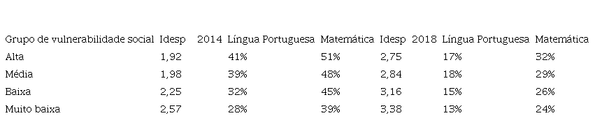 Ao ser analisado o porcentual de alunos concentrados no nível de desempenho abaixo do básico, identificou-se que as escolas de maior vulnerabilidade social são as que possuem um maior número de alunos nesse nível de desempenho. Porém, também ficou evidenciada que a concentração de alunos nesse nível de desempenho não é exclusividade dessas escolas, pois aquelas que estão localizadas em territórios com menor vulnerabilidade social também possuem um porcentual significativo de alunos sem o nível de conhecimento necessário para progredirem de forma contínua.
