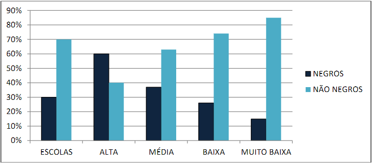 Há uma maior concentração de alunos negros nas escolas de alta vulnerabilidade social. As dificuldades nos primeiros anos da escolarização podem ter desdobramentos significativos para alunos negros (Koslinsky & Bartholo, 2020). Essas dificuldades se perpetuam no EF e se acumulam ainda mais no EM, barrando o acesso ao ensino superior e diminuindo as oportunidades no mercado de trabalho (Artes & Unbehaum, 2021), estabelecendo desigualdades para além da educação, difíceis de serem superadas. Essa questão pode trazer implicações para a prática da cidadania e ao pleno desenvolvimento dos indivíduos, no momento em que necessitariam da qualidade formativa da escola contribuindo com a sua autonomia econômica e social (Marchelli, 2016). Ademais, a educação básica é direito público e subjetivo no Brasil, reforçando, nesse ponto, a injustiça no sistema educacional (Crahay, 2000; Dubet, 2009; Ribeiro, 2014).