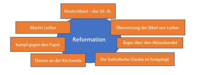 At the very beginning of the lesson, we asked the students to work in groups and create the mind-map on the topic “Die Reformation”. Let us present one example below - the result of group work.